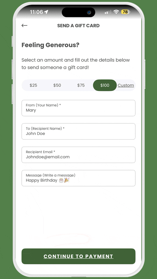 Enter your recipient’s details and your payment method. You can add a personalized message to make it extra special